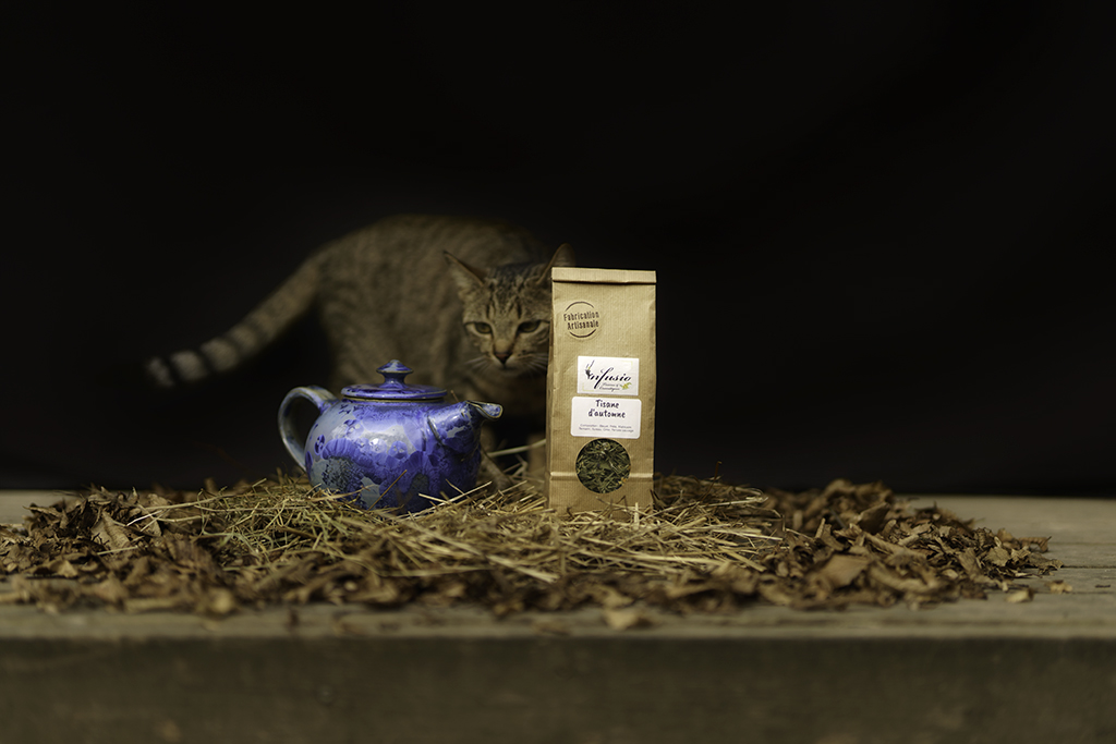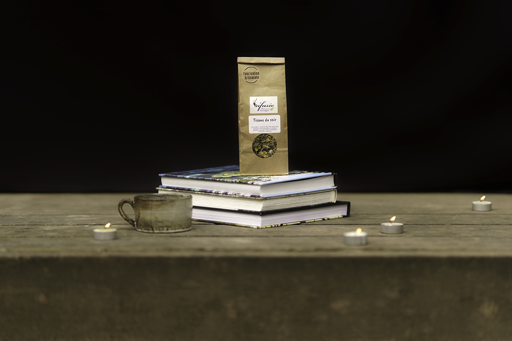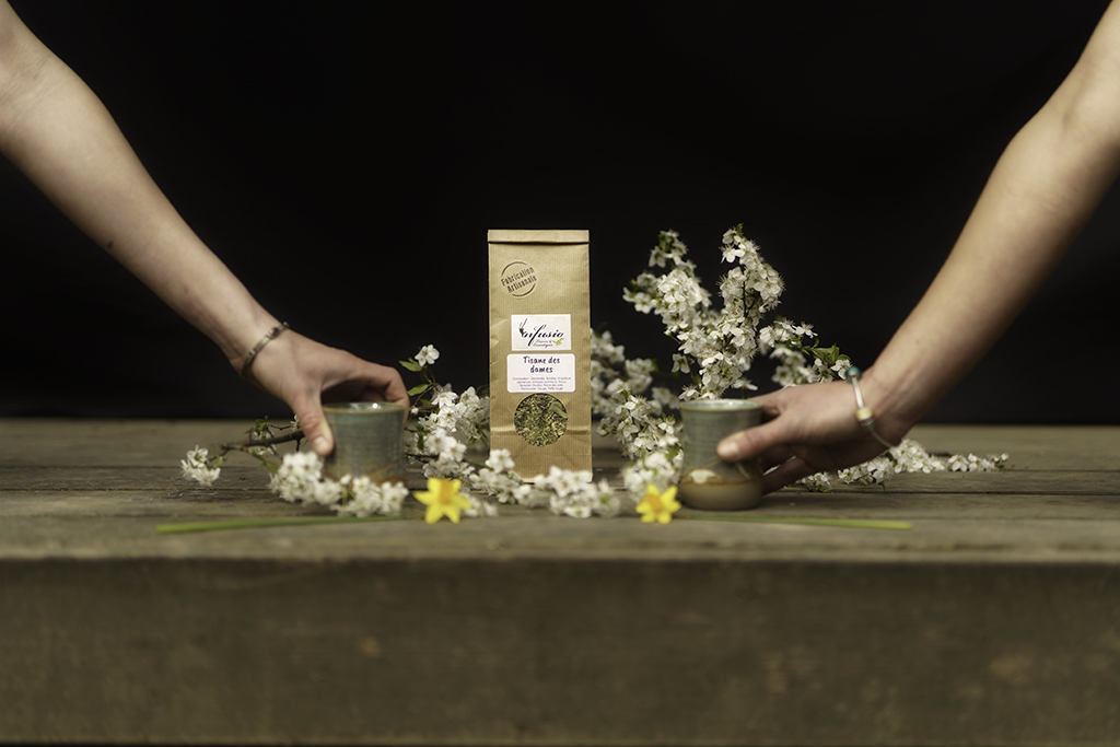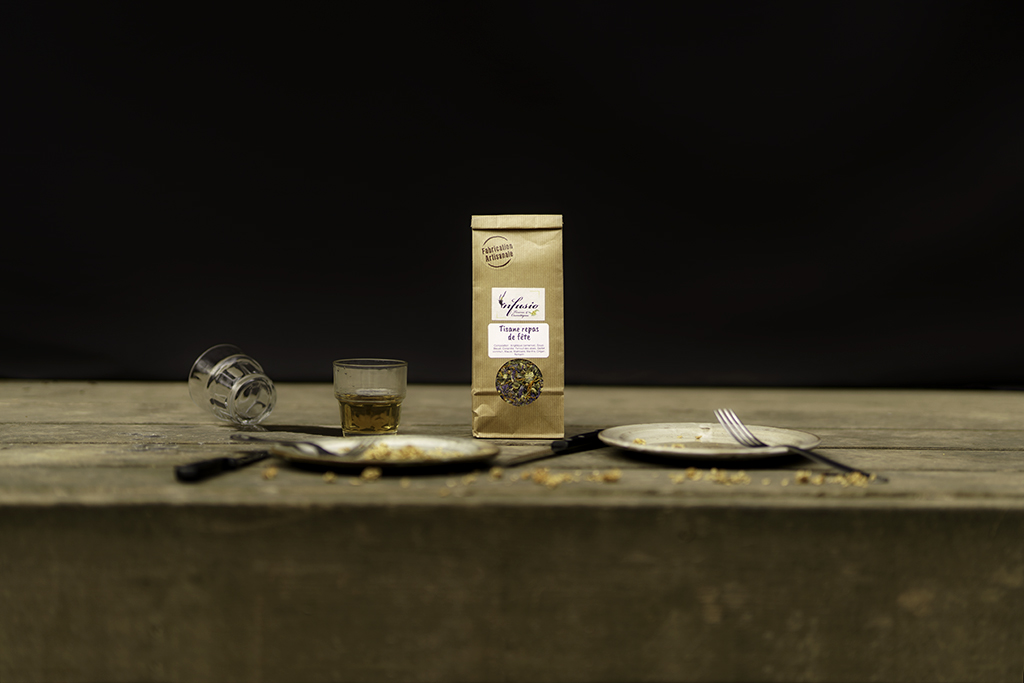 Ludo vend des tisanes et des macérats, et il souhaitait quelque chose de différent que de simples paquets sur fond blanc. Je lui ai donc proposé de faire de la photographie de produit mis en scène. Nous sommes même allés plus loin en créant un scénario pour chaque tisane. Chaque tisane aborde une thématique et a un nom comme « Tisane des Dames » ou « Repas de Fêtes ».