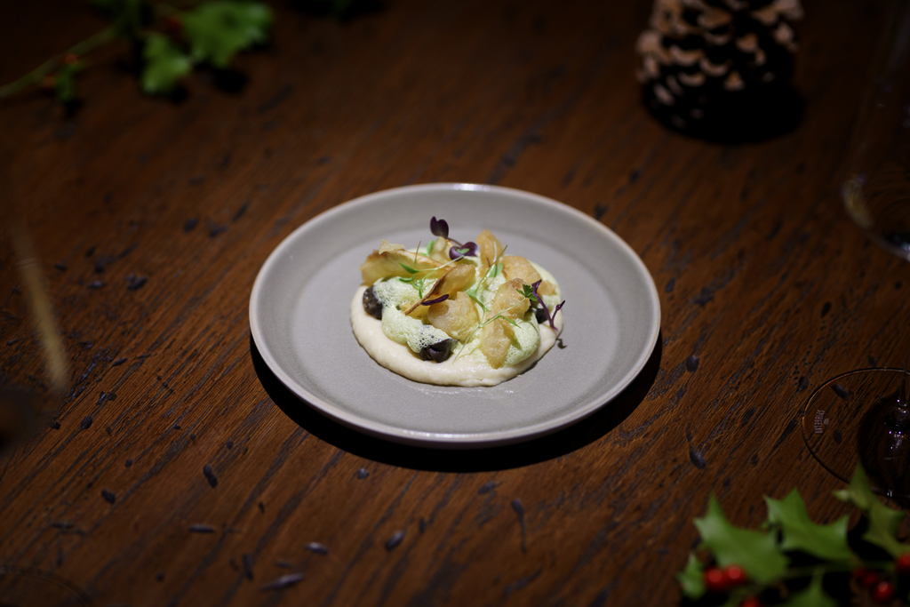 Quelques accessoires suffisent à rappeler cette période magique. Une ambiance tamisée et rustique, avec le bois de la table, une touche de houx, et un joli flou, font tout le charme d’une photographie feutrée et moderne.